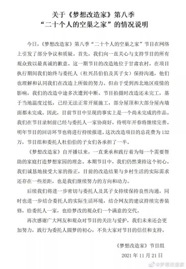 很快,《梦想改造家》节目组在微博回应,称节目中呈现的房屋还未真正完工,之后将进一步完善。同时,对所耗费用节目组将与委托人各承担一半。随后,《梦想改造家》赞助商立邦也发声回应。